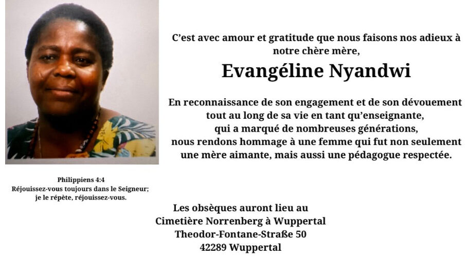 La famille invite amis et proches à se joindre à eux pour rendre hommage à la mémoire de Madame Nyandwi. Pour tout soutien ou information, les contacts sont disponibles, notamment celui de sa fille, Dr Kariyo-Grâce Nyandwi.
