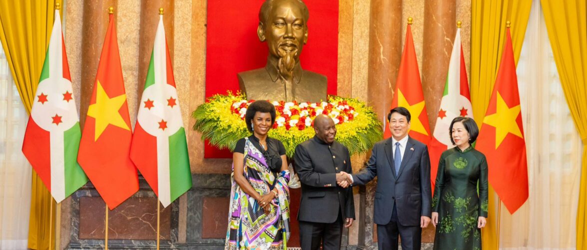 Hanoï, Vietnam, 5/04/2025 – Le Président burundais, S.E. Ndayishimiye Evariste (Général Major), accompagné de son épouse, la Première Dame S.E. Ndayubaha Angéline, et de son excellent ministre burundais des Affaires étrangères Shingiro Albert, a effectué une visite d’État au Vietnam. Lors de cette visite, il a rencontré son homologue S.E. Luong Cuong, Président du Vietnam, accompagné de son épouse S.E. Nguyen Thi Minh Nguyet, au Palais Présidentiel de Hanoï. Cette rencontre était centrée sur le renforcement des capacités de défense nationale du Burundi grâce aux technologies satellitaires.