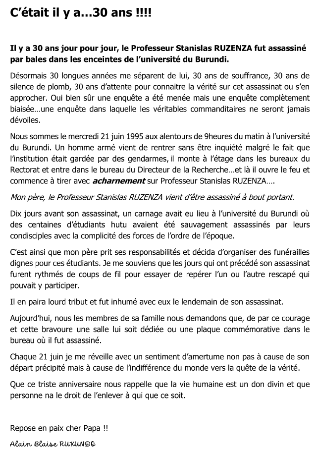 Lettre intégrale de Rukundo Alain Blaise : [ https://burundi-forum.org/wp-content/uploads/2025/06/Hommage-au-Professeur-Stanislas-RUZENZA.pdf ]