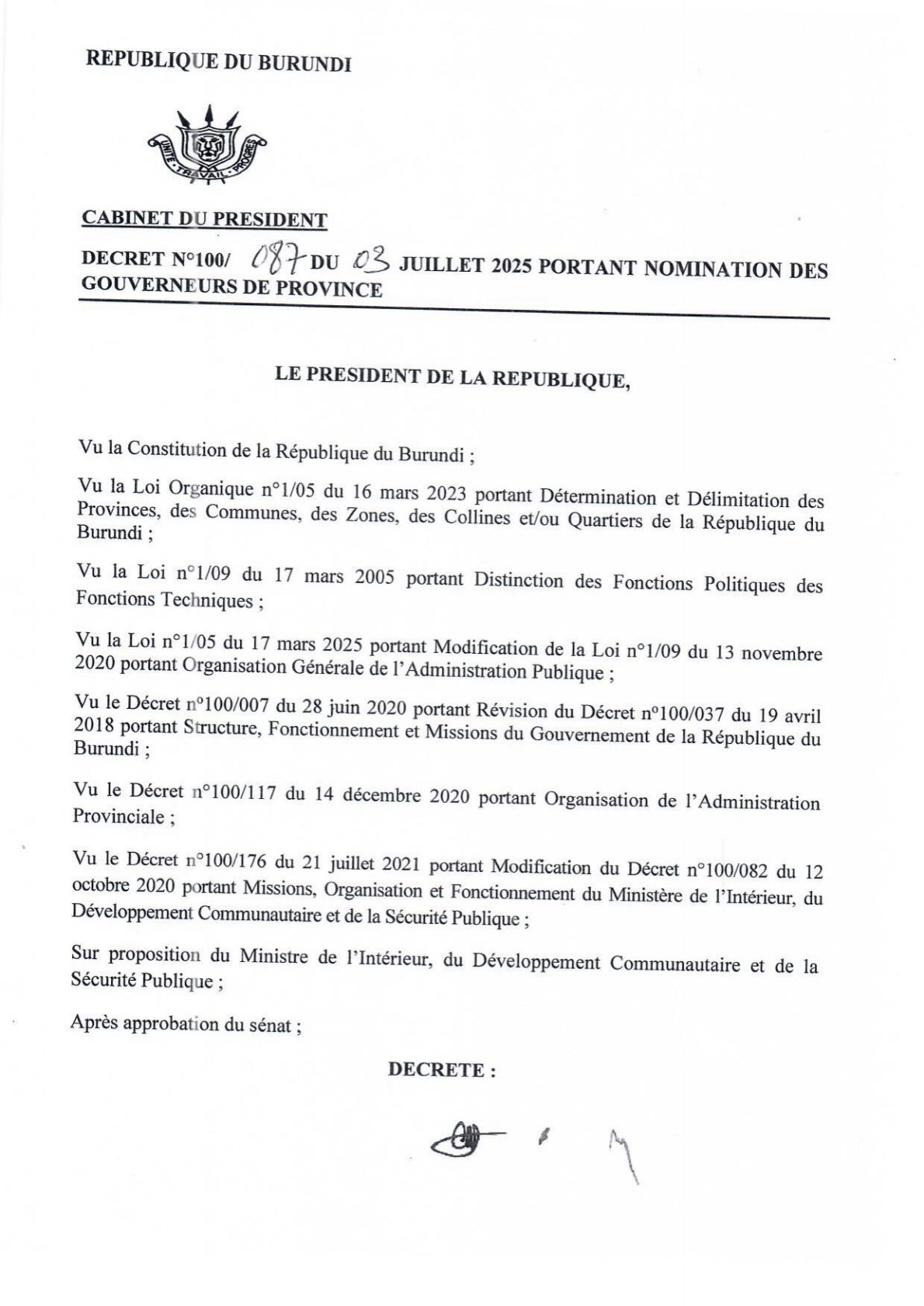 Gitega, 3 /07/2025 – Le Président du Burundi, S.E. Ndayishimiye Evariste (Général-Major), a officiellement nommé cinq nouveaux gouverneurs provinciaux, conformément au décret n°100/087 signé ce 3 juillet 2025, suite à l’approbation du Parlement. Ces nominations s’inscrivent dans le cadre de la mise en œuvre de la nouvelle réforme administrative qui restructure la gouvernance locale.