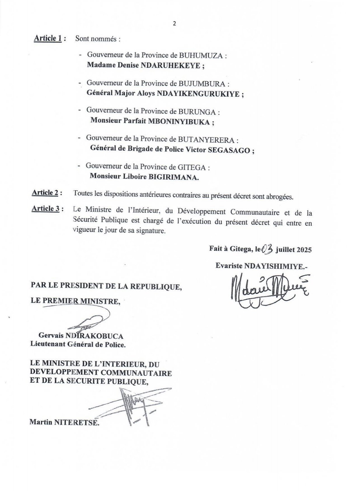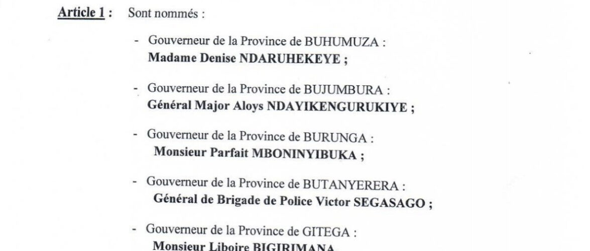 Les nouveaux gouverneurs sont : Ndaruhekeye Denise pour la province Buhumuza, Ndayikengurukiye Aloys (Général-Major) pour la province Bujumbura, Mboninyibuka Parfait pour la province Burunga, Segasago Victor (Général de brigade de police) pour la province Butanyerera, et Bigirimana Liboire pour la province de Gitega.