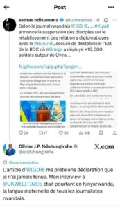 L’escalade s’est poursuivie lorsque le journal Igihe, considéré comme la voix officieuse du FPR, a déformé les propos du Ministre en lui attribuant faussement une annonce de rupture totale entre le Burundi et le Rwanda. Cette manipulation a été reprise avec enthousiasme par des activistes en ligne comme Pacifique Nininahazwe et l’ancien journaliste Esdras Ndikumana, créant une tempête médiatique obligeant le Ministre burundais des Affaires étrangères, Son Excellence Edouard Bizimana, à réagir avec fermeté.