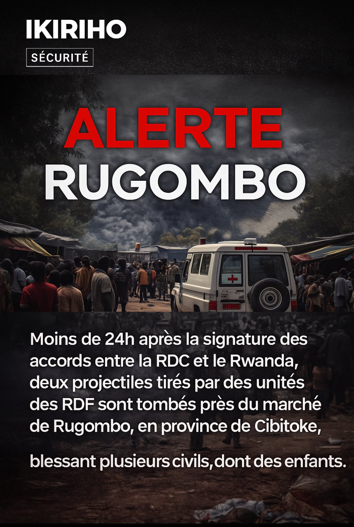 Bujumbura ( Cibitoke ), 5/12/2025 – Pour la première fois de l’histoire récente, le territoire burundais est frappé directement. Ce matin, les Rwanda Defence Forces (RDF) auraient largué deux projectiles à proximité du marché de Rugombo, à Cibitoke, province Bujumbura, à la frontière avec la RDC.