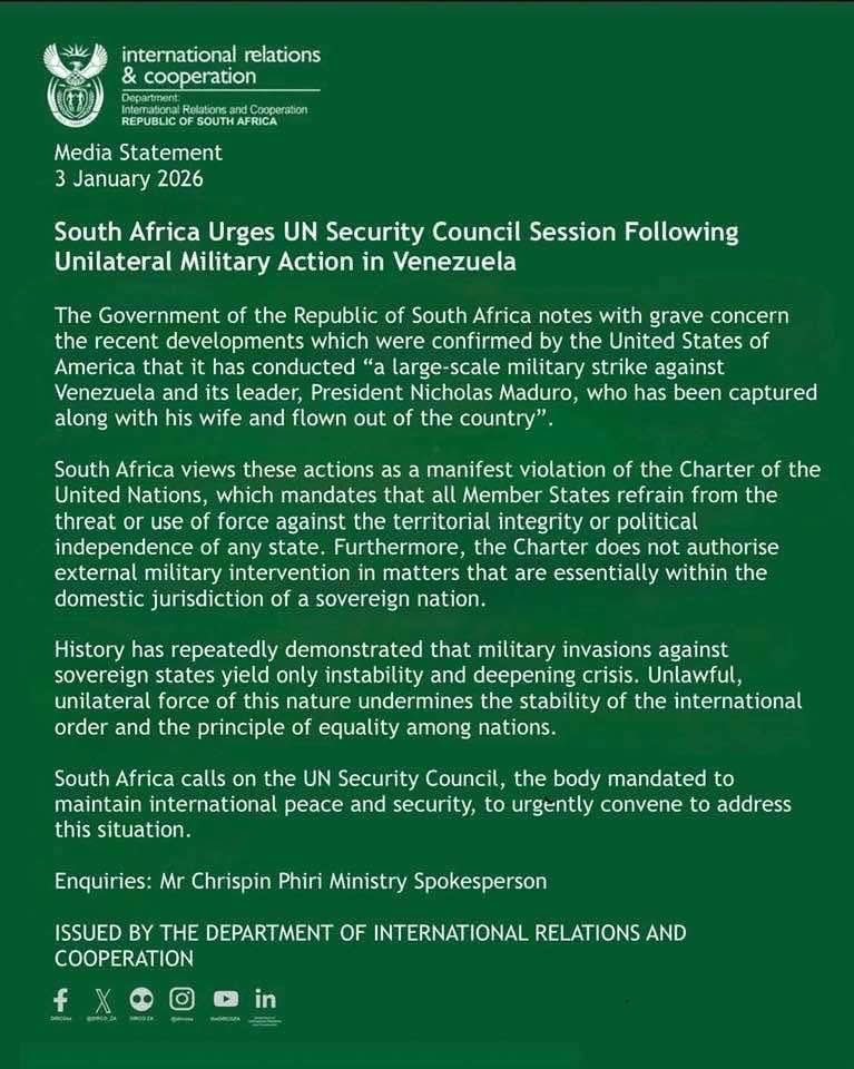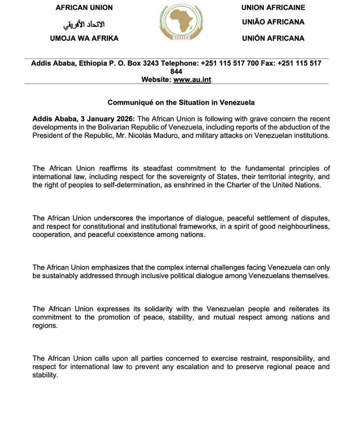 Gitega, 3/01/2026 – Dans notre nouveau monde multipolaire, dans la guerre géopolitique que mène les USA contre la Chine, les USA ont franchi un autre cap cette nuit… S.E. Maduro Nicolás, président de la République bolivarienne du Venezuela, ainsi que son épouse Cilia Flores. ont été volés par les USA. Dans la région des Grands Lacs africains, et particulièrement au Burundi, cette nouvelle provoque une profonde consternation. Cette intervention des USA constitue une violation flagrante du droit international. Delcy Rodríguez, vice-présidente du Venezuela, exige la libération de Maduro Nicolás et de son épouse.