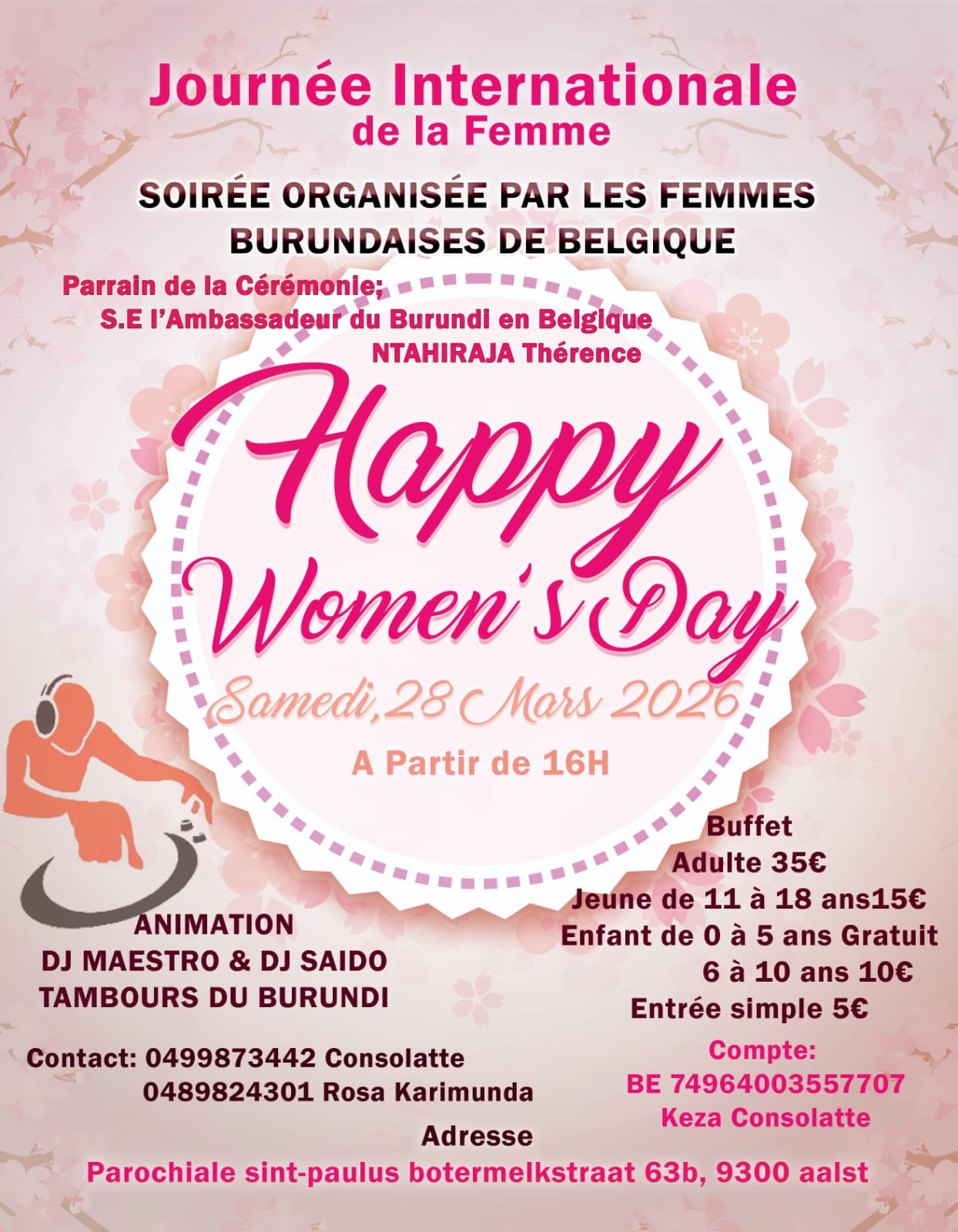 Alost (Ububiligi), 28/03/2026 (BdiAgnews) – Imbere ya 1929, umwaka Mukakaryenda yahindurwako idini ku nguvu, uwo Mugore w’Ingoma nyeranda Karyenda, yitwa Ruburisoni hanyuma agahindurwa ku nguvu Maria Ruburisoni, Uburundi bwari burongowe n’umugore ari kumwe na Mwami. Ingoma y’Uburundi yari dyarchie. Mu kwizihiza umunsi mpuzamakungu wahariwe umukenyezi, abakenyezi b’Abarundi baba mu Bubiligi, baserukira diaspora y’Abarundi, bateguye ibirori vy’akanyamuneza ku wa gatandatu 28 Ntwarante 2026 kuva isaha icumi z’umugoroba ku cumba c’amakoraniro ca Saint-Paul i Alost. Ico gikorwa, kiri munsi y’ubuserukizi bw’Ambasaderi w’Uburundi mu Bubiligi, Ntahiraja Thérence, akunzwe na benshi, kigamije guhimbaza uruhara n’intererano vy’abakenyezi mu mibano. Mu vyategekanijwe harimwo imyidagaduro y’umuco irimwo DJ Maestro na DJ Saido, hamwe n’ingoma z’Uburundi, mu kirere c’akanyamuneza kigenewe bose, harimwo ifunguro n’uburyo butandukanye bwo kwinjira. Ico gikorwa cerekana ubushake bwa diaspora y’Abarundi bwo gukomeza imigenderanire myiza mu mibano, mu muco no mu muryango w’Abarundi baba mu Bubiligi.