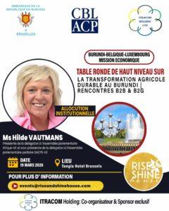 Bruxelles (Ububiligi), 19 Ntwarante 2026 (BdiAgnews) –Ku wa 19 Ntwarante 2026, muri Tangla Hotel Brussels, habereye ikiganiro co ku rwego rwo hejuru kijanye no guhindura uburimyi mu Burundi mu buryo burama, cahuje abategetsi, abadiplomate, inzego zitandukanye hamwe n’abashoramari bo mu Buraya, kikaba categuwe ku bufatanye na ITRACOM Holding kandi kiri munsi y’ubuserukizi bw’Umuserukizi w’Uburundi mu Bubiligi, Ntahiraja Thérence, gifise intumbero yo gukoraniriza hamwe abafatanyabikorwa, amashoramari n’ubuhinga bushasha mu guteza imbere uburimyi bw’Uburundi ; intumwa z’Uburundi zari zirongowe na Butoyi Léonard, umufasha w’Umushikiranganji w’Ibidukikije, Uburimyi n’Ubworozi aserukira umushikiranganji Dodiko Prosper, hamwe na Mbarumutima Théodore, umuyobozi mukuru wa ITRACOM Holding, mu gihe ku ruhande rw’u Bubiligi n’Uburaya hari Hilde Vautmans, André Flahaut, Wim Schalenbourg, hamwe n’abaserukira Ubumwe bw’Uburaya, Ibanki y’Uburaya y’Iterambere, Enabel n’abandi bashoramari ; muri uwo murongo, ITRACOM Holding iragaragaza uruhara rwayo rukomeye mu kumenyekanisha igihugu ku rwego mpuzamakungu (nation branding), biciye mu kwaguka mu karere, ibikorwa vyayo mu buhinzi n’inganda z’ivyimburwa hamwe n’aho yihagararaho kw’isi yose, ivyo bikaba bituma ishusho n’ubutunzi bw’Uburundi birushiriza kumenyekana, aho mu kurangiza, Umuserukizi Ntahiraja Thérence yashimye cane urwego rw’ivyaganiriweko bijanye no gukomeza urunani rw’ivyimburwa mu burimyi bw’Uburundi biciye mu bufatanye hagati ya Leta n’abikorera utwabo.