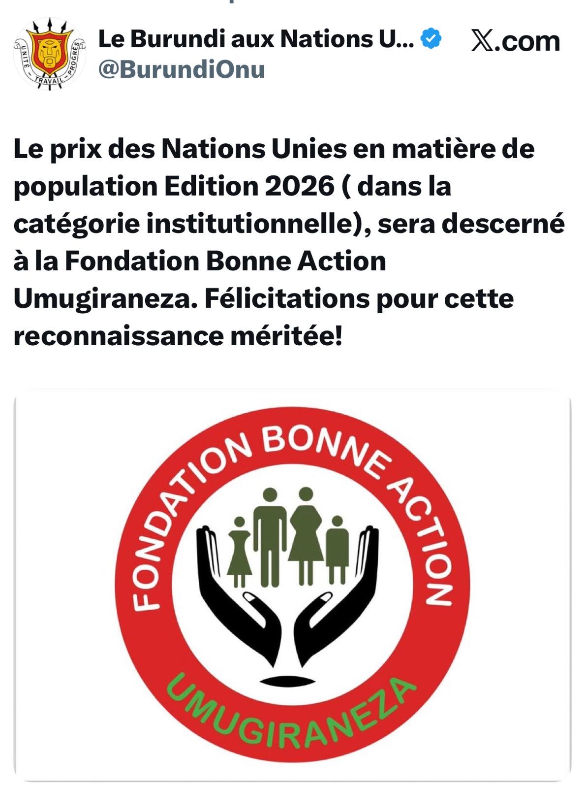 Cette distinction prestigieuse, décernée par les Nations Unies, récompense les initiatives remarquables de la Fondation en faveur du bien-être des populations, tant au Burundi que dans la région.