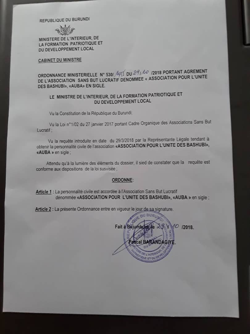 SOCIETE CIVILE – BUJUMBURA,29/10/2018 – M. Pascal BARANDAGIYE, Ministre burundais de l’Intérieur, a agréé, par ordonnance ministérielle l’Association pour l’Unité des Bashubi, AUBA. Voici l’ordonnance ministérielle n°530/1415 du 29/10/2018 portant agrément de l’Association pour l’Unité des Bashubi, AUBA.en sigle :