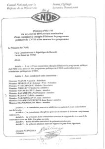 Voici ce que nous avons retrouvé dans nos placards pour vous faire partager : https://www.burundi-forum.org/wp-content/uploads/2018/11/bdi_burundi_1er_Bureau_Politique_du_CNDDFDD_1995.pdf