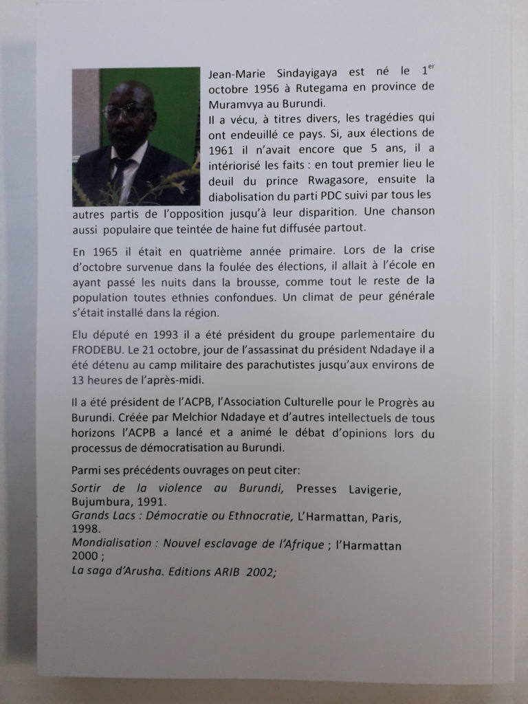 Ce dernier livre de M. SINDAYIGAYA se veut être une réflexion, destinée aux Burundais, pour les prochains scrutins électoraux de 2020 qui s’annonce.