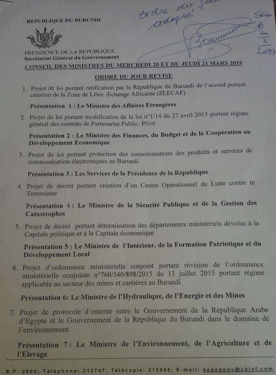 GOUVERNEMENT – GITEGA ( Capitale du Burundi, Palais de Gitega ), 20/03/2019 – Le Conseil des Ministres sous la présidence du Chef d’état du Burundi, S.E. Pierre Nkurunziza, se réunit du mercredi 20 au jeudi 21 mars 2019, avec 9 points à l’ordre du jour dont le projet de décret portant détermination des départements ministériels dévolus à la capitale politique – Gitega – et la capitale économique – Bujumbura – .