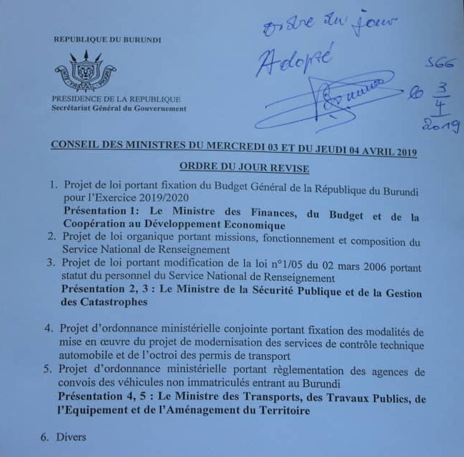 INSTITUTION – BUJUMBURA ( Palais Présidentiel ), 3/05/2019 – S.E. Pierre Nkurunziza, Président de la République du Burundi, préside en Commune Mutimbuzi, colline Gatunguru, Zone Gasenyi, le Conseil des Ministres ce mercredi 3 avril 2019, avec à l’ordre du jour 5 projets, présentés par le Ministre burundais des Finances ( concernant le Budget Générale 2019-2020 ) , le Ministre burundais de la Sécurité publique ( concernant le Service Nationale de Renseignement SNR ), et le Ministre burundais des Transports ( concernant le permis de transport et les véhicules non immatriculés ).