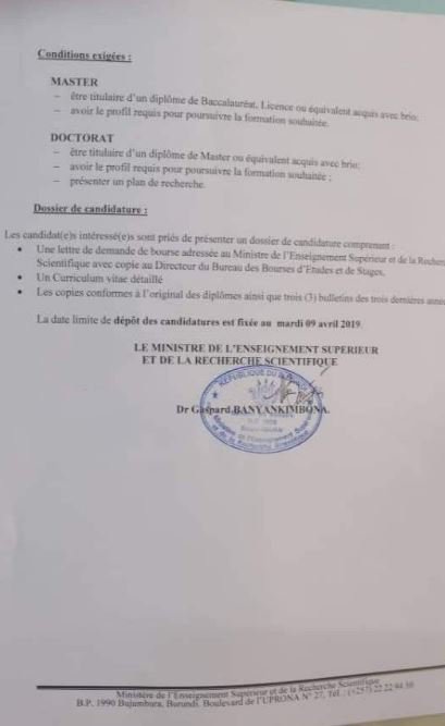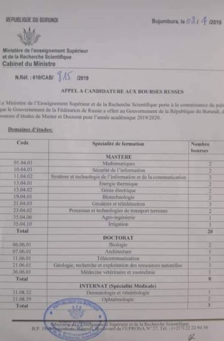 ÉDUCATION, DIPLOMATIE – BUJUMBURA, 2/04/2019 – M. Gaspard Banyankimbona, Ministre burundais de l’Enseignement Supérieur, a annoncé que la gouvernement de la fédération de Russie offrait au Burundi 20 bourses en master, 8 pour des doctorats et 3 pour des résidences en spécialités médicales. Les dépôts de candidature sont fixés au mardi 9 avril 2019.