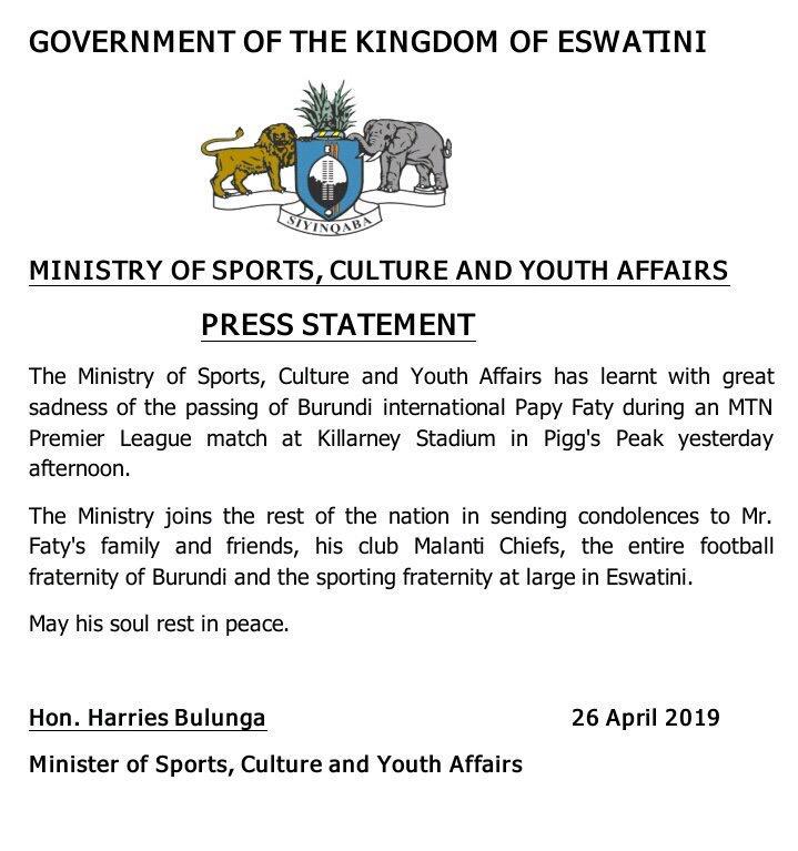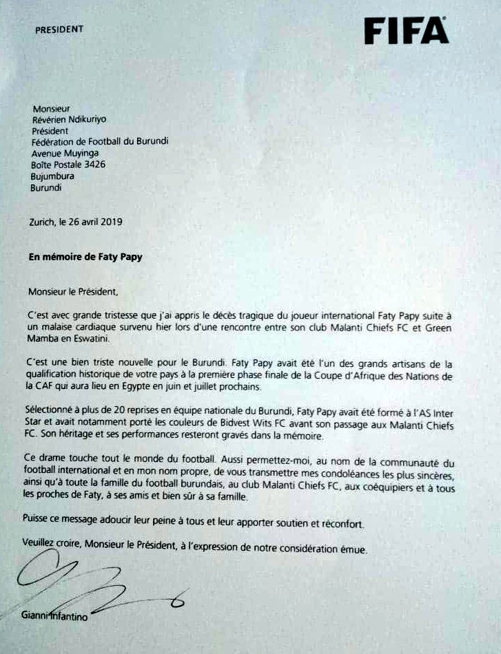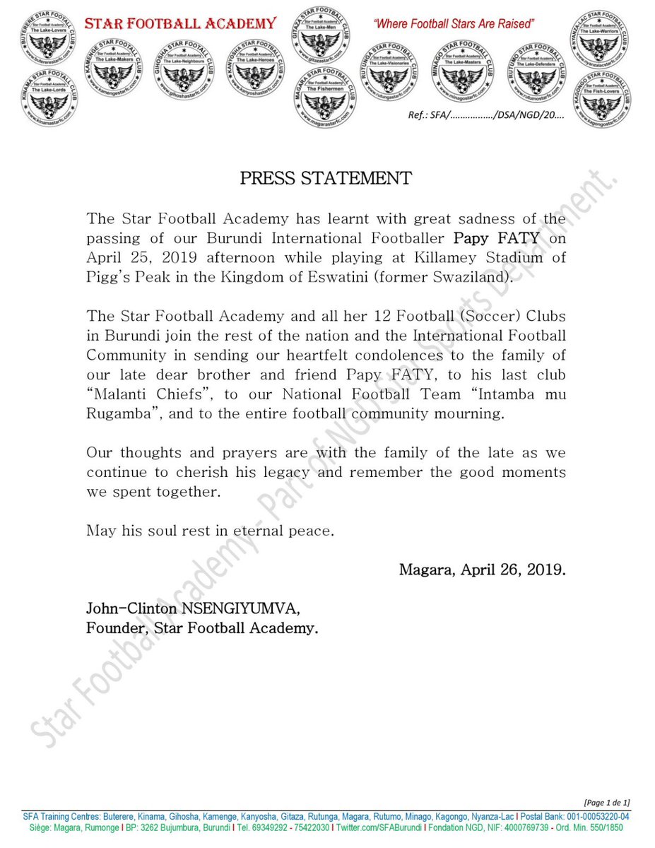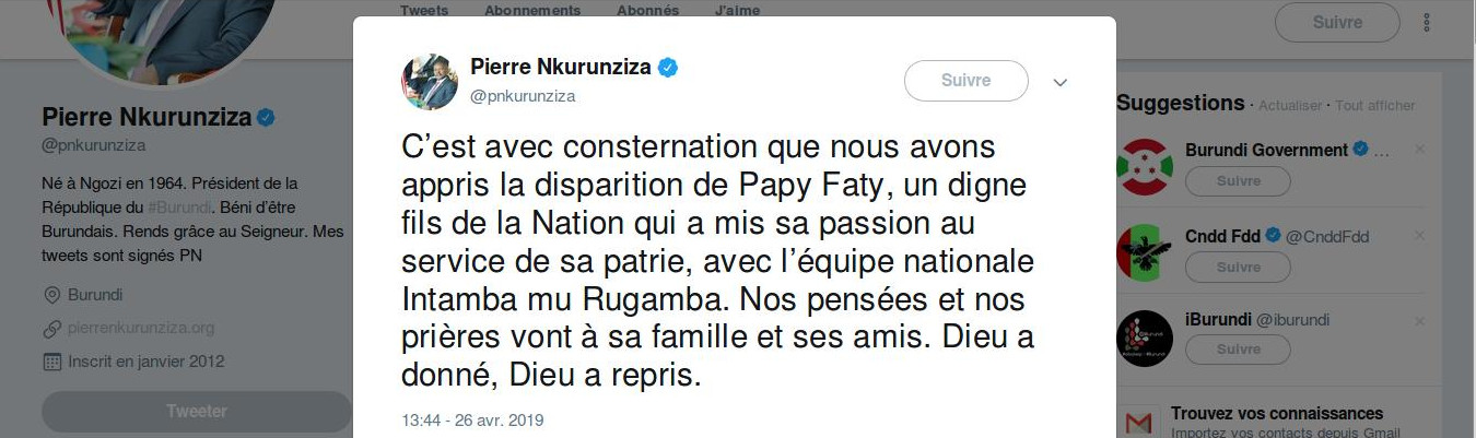Voici le tweet de Condoléance du Président en vers les proches de Papy Faty et les condoléances officielles de la Fédération de Football du Burundi (FFB), de l’Etat du Swaziland, de son club – Star Football Academy – , et de la FIFA :