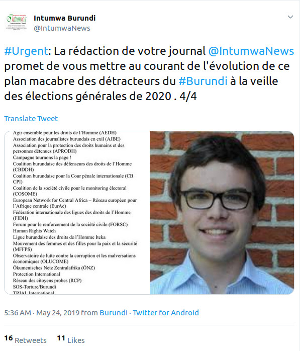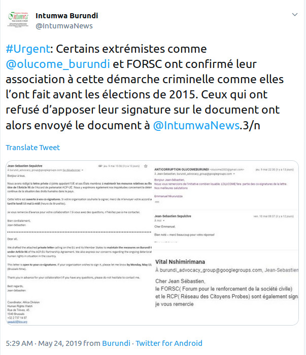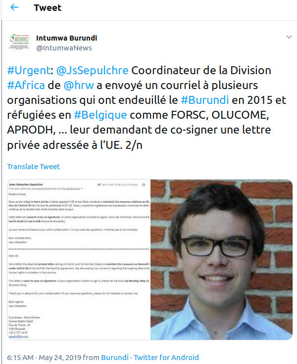 INTUMWA présente pour fait un courriel que voici : [ https://www.burundi-forum.org/wp-content/uploads/2019/05/bdi_burundi_HRW_SOROS_UE_guerre_humanitaire_2019_intumwa.pdf ]