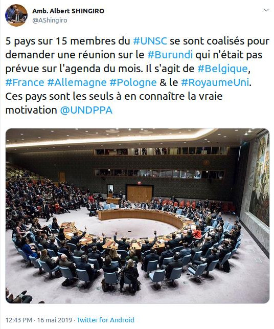 GÉOPOLITIQUE, DIPLOMATIE, REGION DES GRANDS LACS AFRICAINS, EAC, GLOBALISATION, DEFENSE, SECURITE – Bruxelles, 27/05/2019 – L’Amb. Albert SHINGIRO, Représentant Permanent du Burundi à l’ONU, s’est étonné de voir , le jeudi 16 mai 2019 , 5 pays occidentaux ( la France, la Belgique, la Pologne, l’Allemagne, et l’Angleterre) , demander que le Burundi demeure à l’agenda du Conseil de Sécurité de l’ONU, appelant à la vigilance.