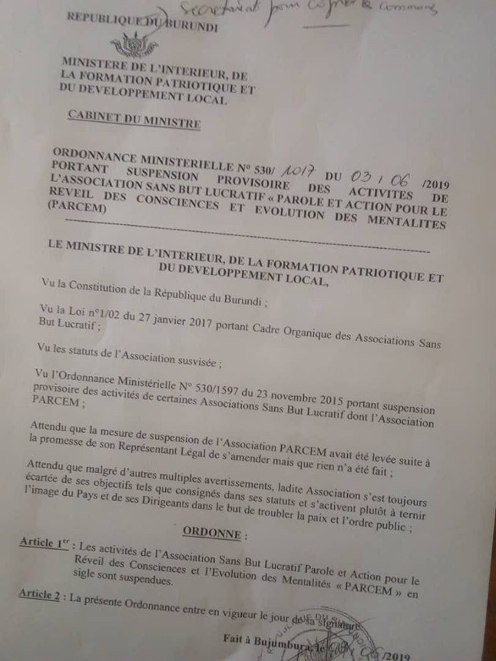 GLOBALISATION, DEFENSE, SECURITE, SOCIETE CIVILE – BUJUMBURA,3/06/2019 – A quelques mois des élections démocratiques burundaises de 2020, dans le soucis d’avoir un climat apaisé au Burundi, le Ministère burundais de l’Intérieur a décidé de suspendre, par ordonnance, l’ONG burundaise PARCEM, liée à des intérêts étrangers, notamment le Réseau du milliardaire américain SOROS ( Open Society ), qui mène une guerre humanitaire contre le Burundi depuis 2015, suite à la révolution de couleur ( ou tentative de changement de régime ) et au coup d’état militaire raté du mercredi 13 mai 2015.