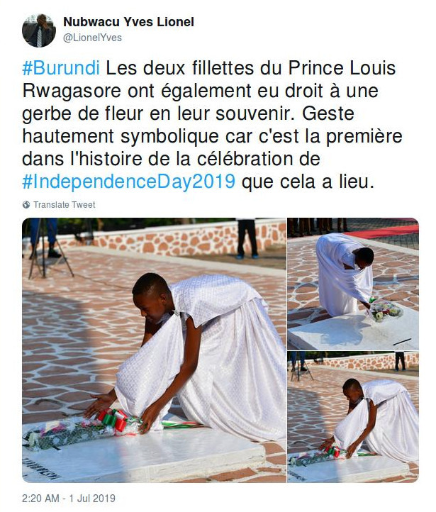 PRESIDENCE, INDÉPENDANCE 2019 – BUJUMBURA, 1/06/2019 – Devant un parterre de diplomates et de toutes les hautes personnalités du pays, S.E. Pierre NKURUNZIZA, accompagné de son Épouse Mme Denise BUCUMI, ont débuté les cérémonies du 57ème anniversaire de l’indépendance du Burundi, par le traditionnel dépôt des gerbes de fleurs, au Mausolée du Prince Louis RWAGASORE. Les deux arrières petites filles du Prince Louis RWAGASORE, toutes émues, ont participé à ce geste symbolique …