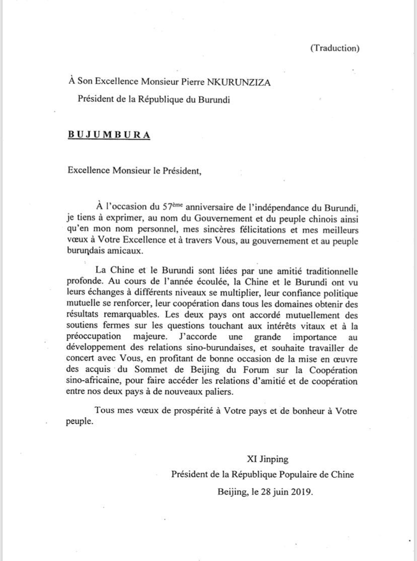 DIPLOMATIE – BEIJING (CHINE), 28/06/2019 – S.E. XI Jinping, Président de la République populaire de Chine, a transmis ses sincères félicitations pour les 57 ans d’Indépendance du Burundi, au nom du peuple Chinois vis à vis du peuple Burundais, à S.E. NKURUNZIZA Pierre, Président de la République du Burundi : « La Chine et le Burundi sont liés par une amitié traditionnelle. J’accorde une grande importance au développement des relations sino-burundaises«