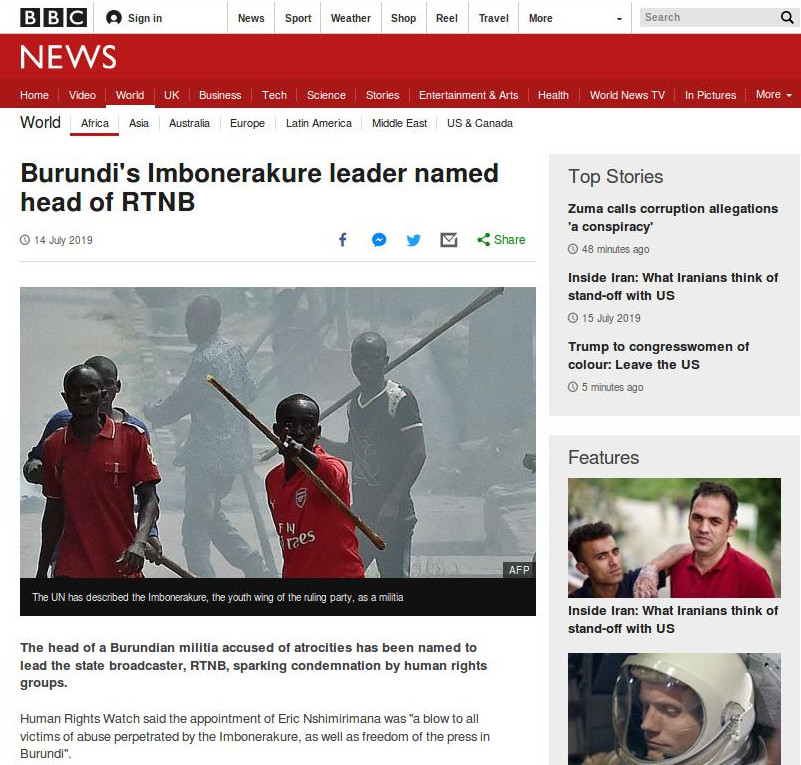 La BBC utilise une image pour illustrer la jeunesse du CNDD-FDD, appelée IMBONERAKURE [ https://www.bbc.com/news/world-africa-48980959 ], celle des INSURGES des manifestations interdites d’avril et mai 2015, présentant les jeunes burundais mobilisés par les ONGs FOCODE, FORSC, et APRODH, lors de la REVOLUTION DE COULEUR AU BURUNDI EN 2015 qui s’est soldée par le coup d’état militaire raté du mercredi 13 mai 2015.