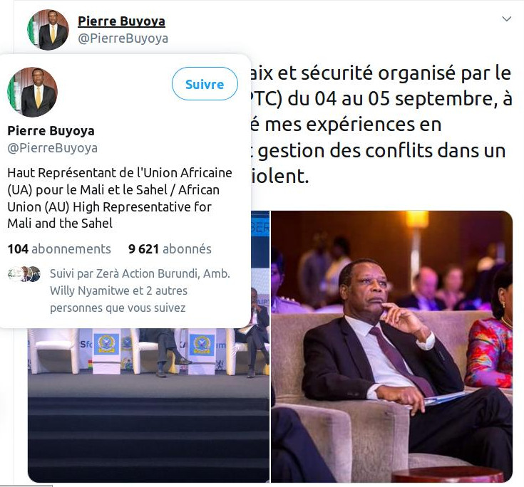 Voici le tweet où l’ancien Dictateur burundais BUYOYA arbore son statut de Haut Représentant de l’Union Africaine (UA) pour le Mali et le Sahel / African Union (AU) High Representative for Mali and the Sahel, en disant :