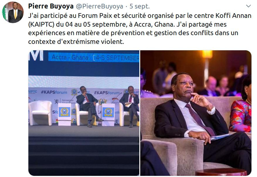 GLOBALISATION, DÉFENSE, JUDICIAIRE, SECURITE, UNION AFRICAINE – ACCRA (GHANA), 5/09/2019 – L’ancien Dictateur burundais BUYOYA Pierre, frappé judiciairement par un mandat d’arrêt international, s’est donné la peine de narguer l’Etat du Burundi et les Burundais, sur son compte Twitter.