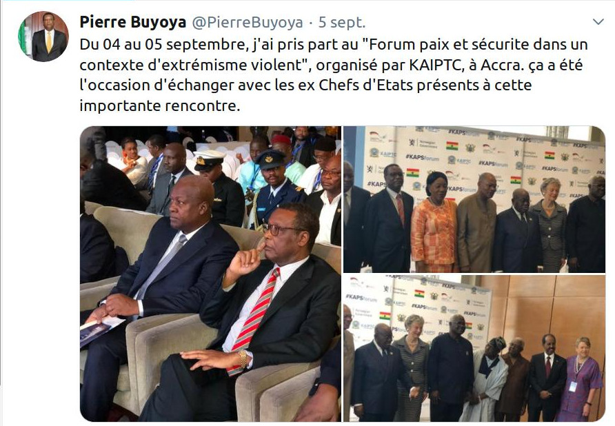 “Du 04 au 05 septembre, j’ai pris part au – Forum paix et sécurite dans un contexte d’extrémisme violent – , organisé par KAIPTC, à Accra. ça a été l’occasion d’échanger avec les ex Chefs d’Etats présents à cette importante rencontre“.