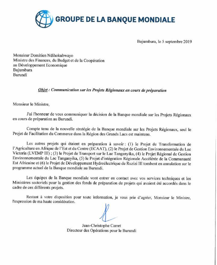 GLOBALISATION, SOCIO-ECONOMIQUE, DEFENSE – Bujumbura, 5/09/2019 – Les financements de tous les projets du Burundi, surtout ceux permettant d’ aider le pays à progresser au niveau socio-économique et industriel, viennent d’être annulés à la Banque Mondiale par M. Christophe Carret, un Français…