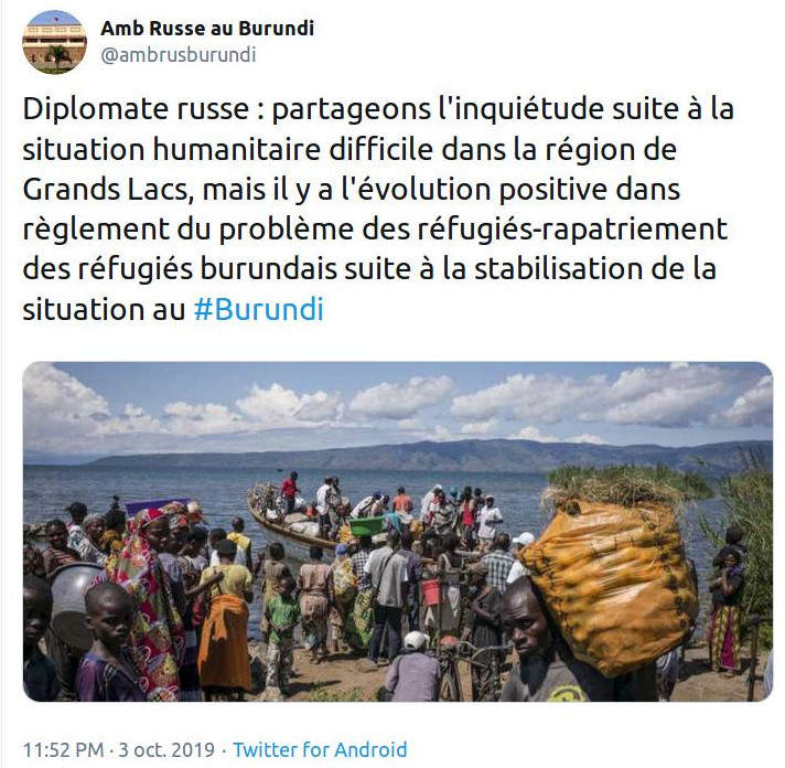 DIPLOMATIE, ONU – BUJUMBURA, 3 /10 / 2019 – L’équipe diplomatique Russe en place au Burundi,sur twitter, dit observer « une évolution positive dans le règlement du problème des réfugiés-rapatriement des réfugiés burundais suite à la stabilisation de la situation au Burundi ».
