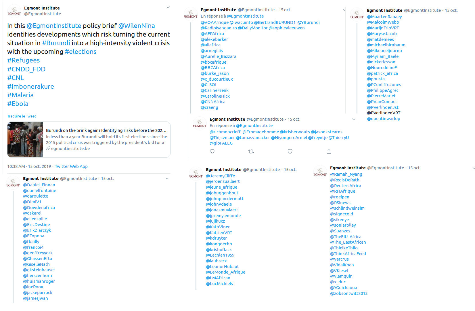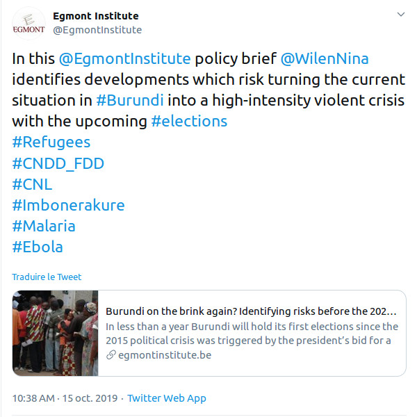 Comme en 2013-2014, avec « le fameux 3ème mandat » , de la Belgique via un tweet de l’ Egmont Institute ( Ministère Belge des Affaires Etrangères ), la thématique de perturbation électorale pour les élections de 2020 au Burundi vient d’être lancée ce mardi 15 octobre 2019.