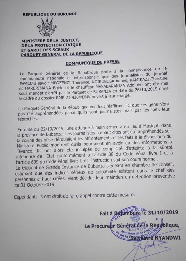 GUERRE GEOPOLITIQUE DES GRANDS LACS AFRICAINS, GLOBALISATION, DEFENSE, SECURITE, TERRORISME, MEDIA, JUSTICE– BUJUMBURA, 31/10/2019 – M. NYANDWI Sylvestre, Procureur Général de la République, a informé, par communiqué de presse, de la raison de l’arrestation des 4 journalistes et du chauffeur du journal IWACU ( Media privé burundais, financé par l’Occident ).