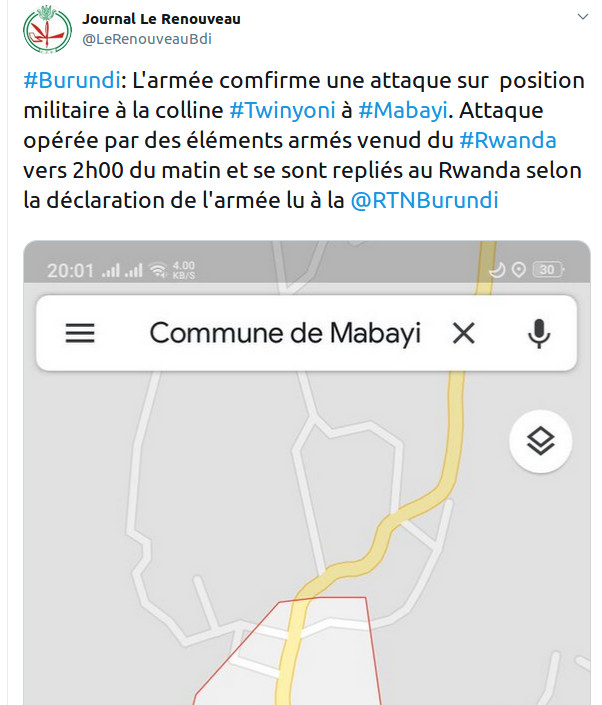 A première vue, le Burundi a été attaqué à la colline Twinyoni en commune Mabayi en province Cibitoke, par des éléments armés venus du Rwanda, samedi 16 novembre 2019 vers 2h00 du matin. En effet, pourchasser par la FDNB, ces éléments armées se sont repliés au Rwanda.