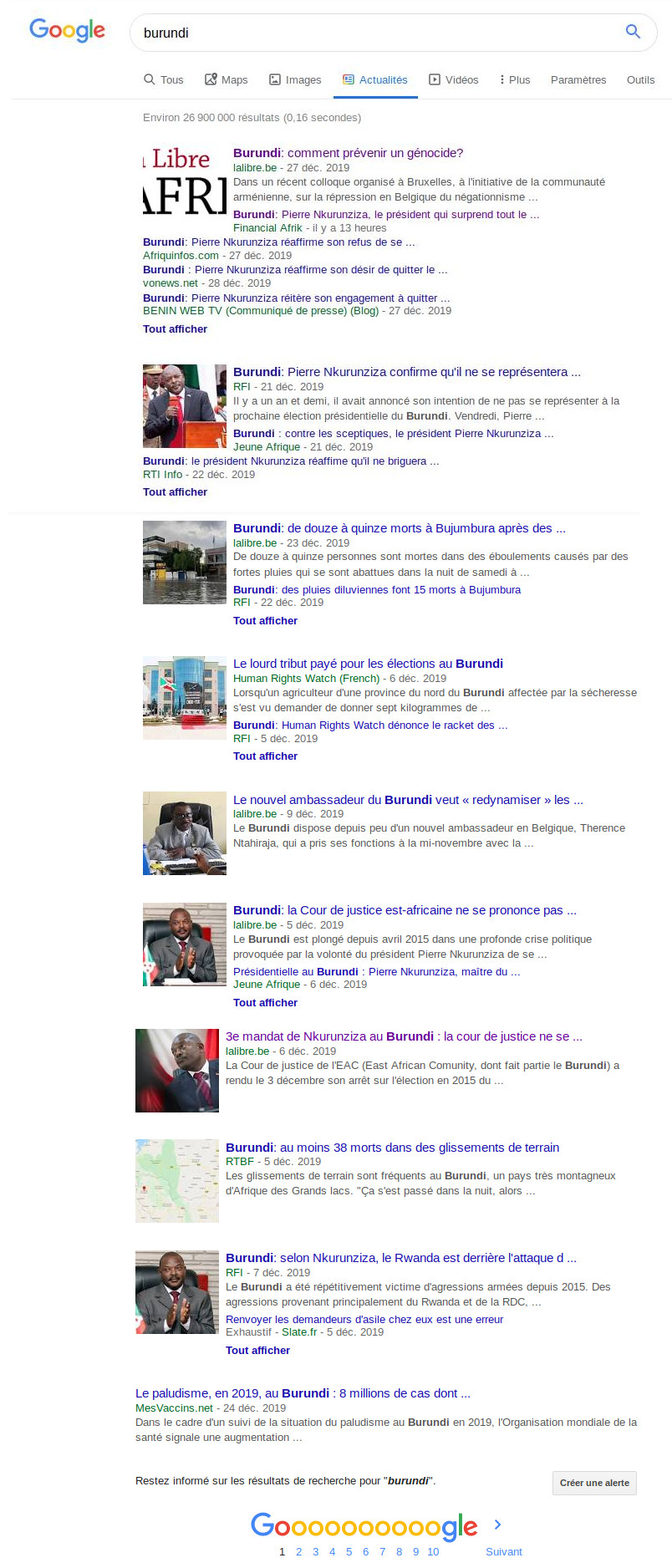 GLOBALISATION, GUERRE HUMANITAIRE, SECURITE, ECONOMIE, MEDIA – BUJUMBURA, 30/12/2019 – La société civile burundaise dénonce l’agression médiatique permanente et illégale de la Belgique et de la France contre le Burundi. Les média de ces 2 pays assombrissent tous les jours l’image du Burundi dans le monde. Par exemple sur GOOGLE ACTUALITES ce lundi 30 décembre 2019 : https://www.burundi-forum.org/wp-content/uploads/2019/12/bdi_burundi_belgique_france_01_30122019_googlenews.pdf