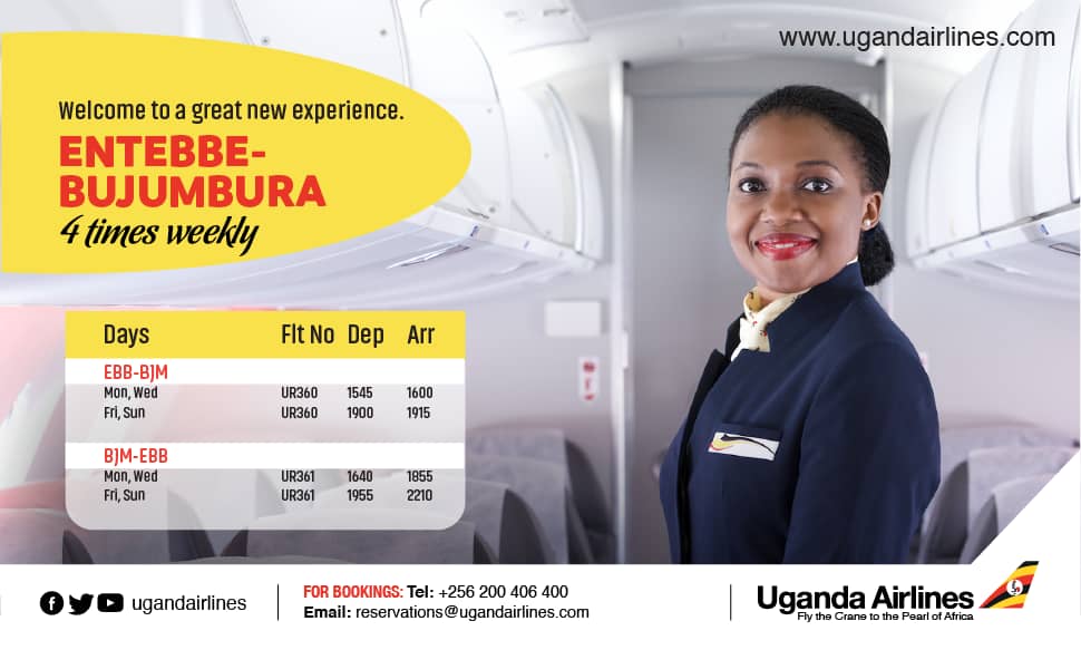 La ligne sera ENTEBBE – BUJUMBURA. Uganda Airlines couvrira cette ligne avec sa nouvelle flotte, son hospitalité à bord, des vols à temps, et avec des tarifs plus compétitifs.