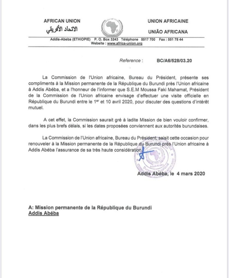 – Addis-Abeba ( Union Africaine ), 3/03/2020 – M. Moussa Faki Mahamat, Président de la Commission de l’Union Africaine (UA), souhaiterait effectuer une visite officielle au Burundi.