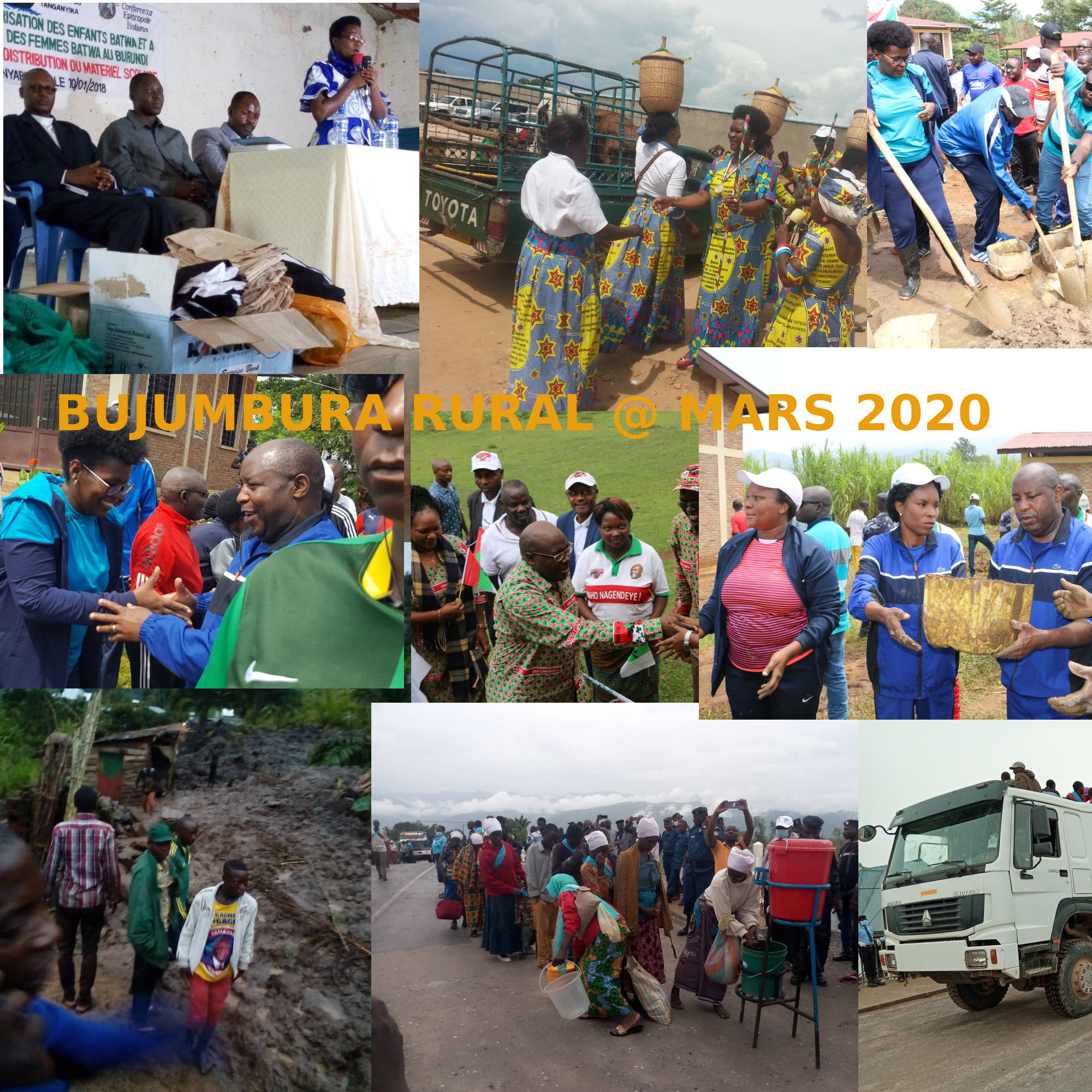 Ces derniers jours. 238 élèves BATWA reçoivent une aide de UNIPROBA à NYABIRABA. Madame GACUTI Nadine reçoit en cadeau des VACHES -INKA- , MUTIMBUZI. Le CNDD-FDD BUJUMBURA reçoit la visite de l’Hon. NTAKIRUTIMANA Joseph, Secrétaire Général Adjoint du parti CNDD-FDD. Les pluies diluviennes cause un éboulement en commune MUBIMBI. Un meurtre a eu lieu à MIGERA, KABEZI, lié à un problème d’ITONGO. La province BUJUMBURA RURAL a reçu l’accueil de 1.628 Burundais expulsés de RDC , venus de GOMA . G.M. NDAYISHIMIYE Evariste, Secrétaire Général du Parti CNDD-FDD était aux TDC pour aménager un terrain de sport à KABEZI.