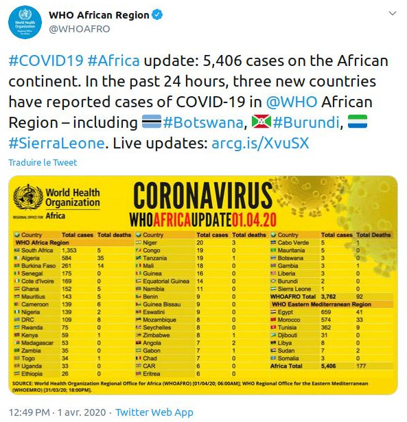 Selon l’OMS AFRIQUE, le continent connaît 5.406 cas de COVID-19 sur 1,2 Milliard de citoyens africain . Dans les 24 heures qui se sont passés, 3 nouveaux pays africains ont connu leur 1er cas : le Botswana , le Burundi , et la Sierra Leone.