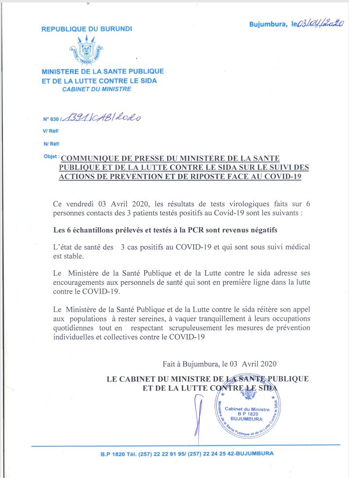 Voici le communique : [ https://www.burundi-forum.org/wp-content/uploads/2020/04/bdi_burundi_Nouveau_Communique_COVID19_03042020.pdf ]