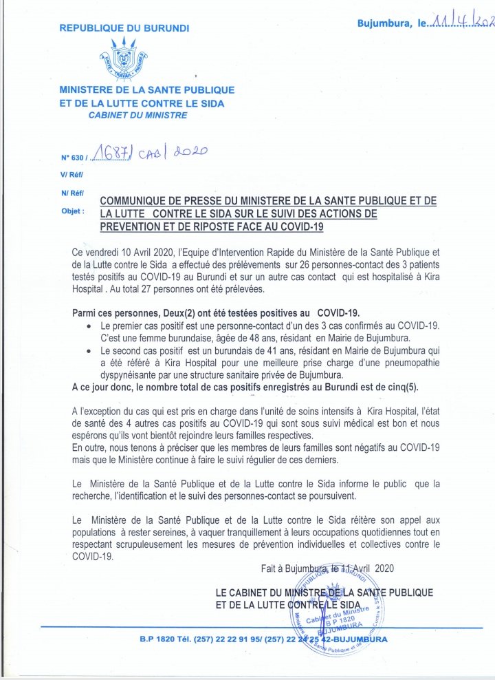Voici le communiqué de presse à cet effet : [ http://burundi-agnews.org/wp-content/uploads/2020/04/bdi_burundi_communique_covid19_11042020_minsantebi.pdf ]
