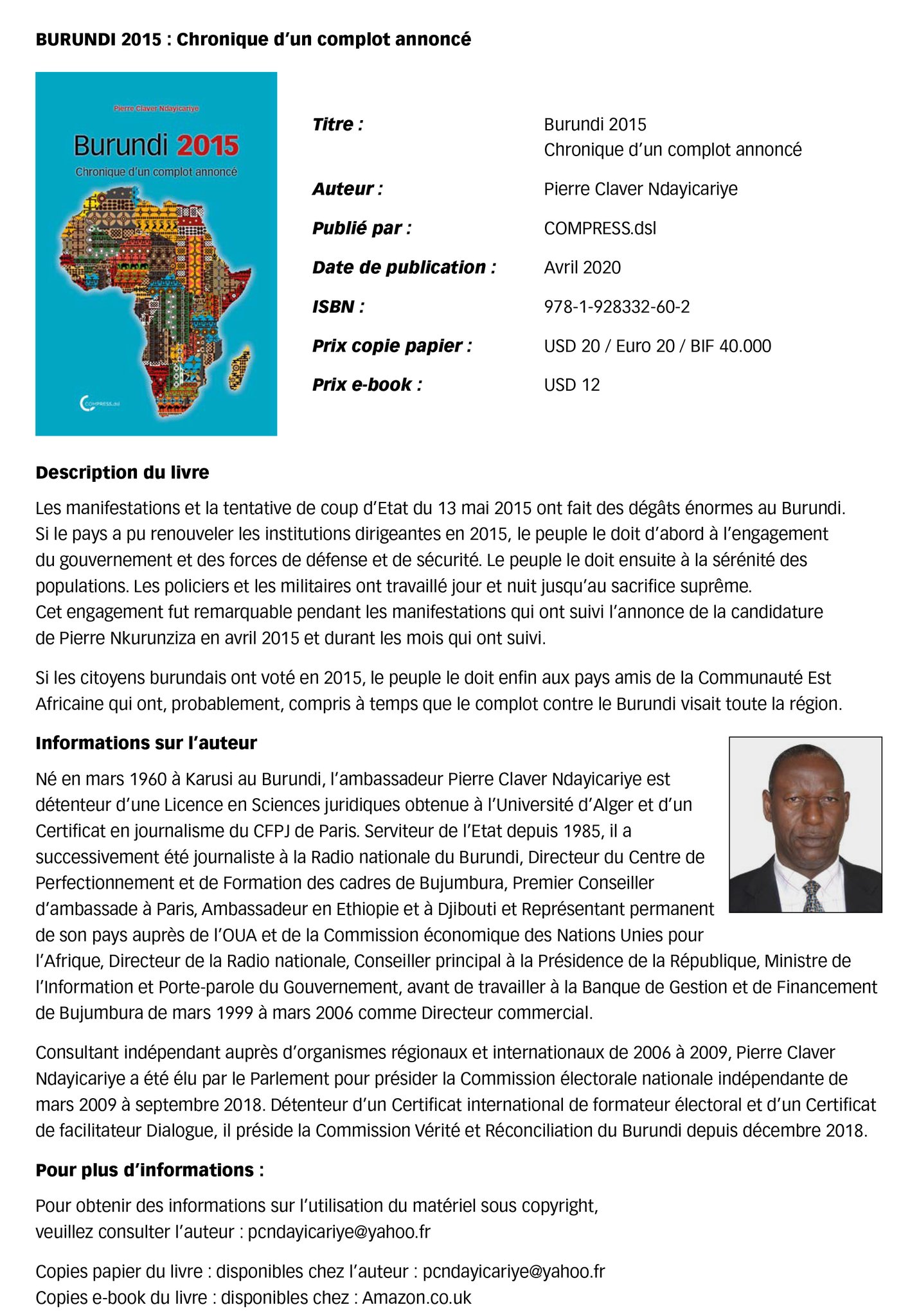 Le Lundi 6 avril 2020, M. NDAYICARIYE Pierre Claver a sorti un livre : « Burundi 2015 : Chronique d’un complot annoncé« .