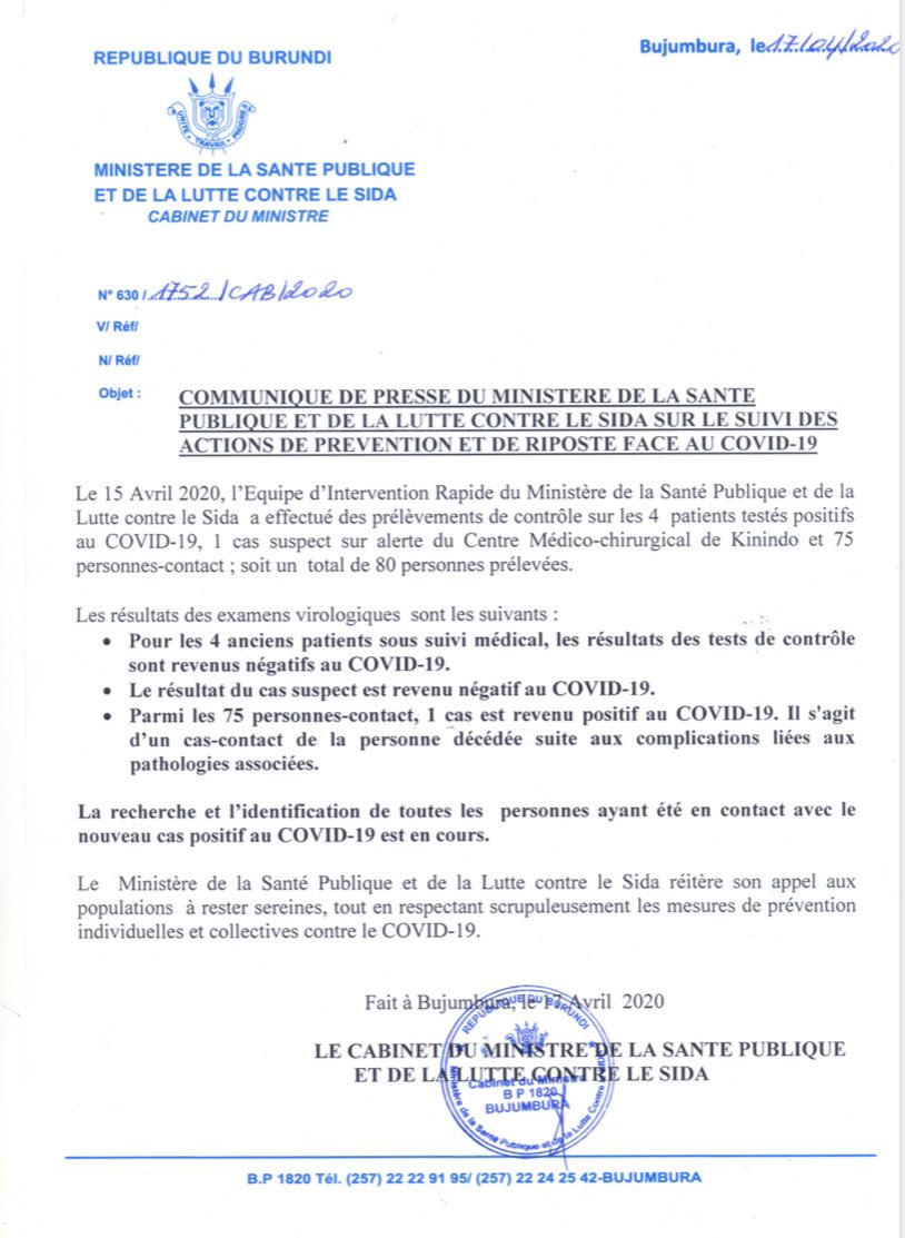 Il y informe : 1/ la négativation du COVIDー19 pour les 4 anciens patients COVID-19 du Burundi. Ainsi, ils ne sont plus -POSITIFS- au COVID-19 ; et 2/ Sur 75 personnes testées le mercredi 15 avril 2020, 1 est sortie confirmée POSITIVE. La recherche des cas contact avec ce dernier est en cours.