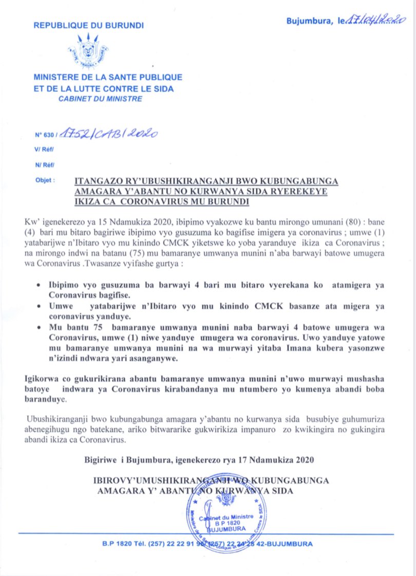 BUJUMBURA, 17/04/2020 – Le Ministère burundais de la Santé Publique vient de sortir un communique de presse.