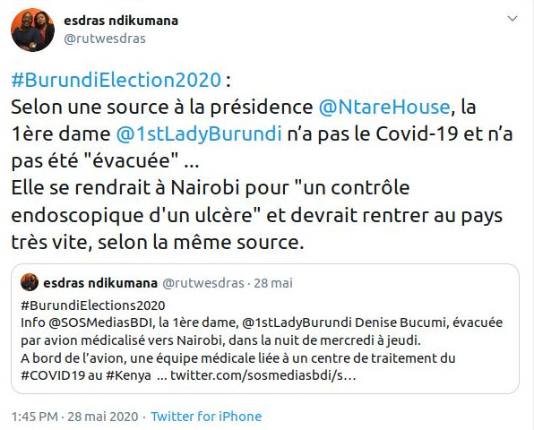 M. NDIKUMANA Esdras, AFP, a préféré garder cette information pour lui. En laissant toutes sortes de commentaires déplaisant sur le Burundi : « Comme quoi elle aurait eu le COVID-19 ».