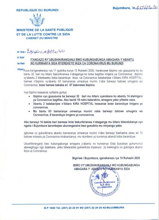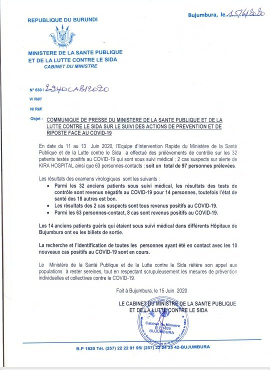 Voici le communiqué gouvernemental de ce lundi 15 juin 2020 : [ https://www.burundi-forum.org/wp-content/uploads/2020/06/bdi_burundi_Nouveau_Communique_COVID19_15062020.pdf ]