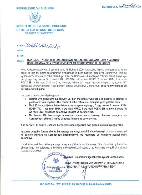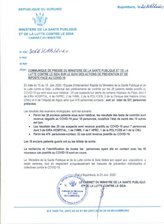 Voici le communiqué gouvernemental de ce samedi 20 juin 2020 : [ https://www.burundi-forum.org/wp-content/uploads/2020/06/bdi_burundi_Nouveau_Communique_COVID19_20062020.pdf ]