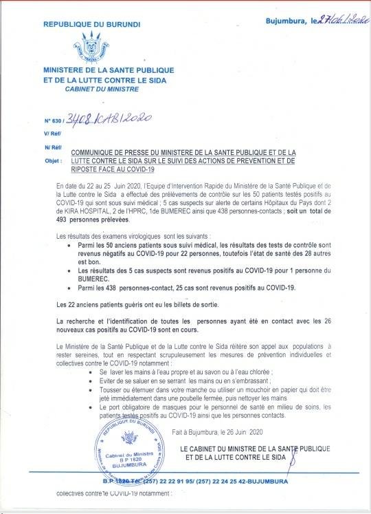 Voici le communiqué gouvernemental de ce samedi 27 juin 2020 : [ https://www.burundi-forum.org/wp-content/uploads/2020/06/bdi_burundi_Nouveau_Communique_COVID19_27062020.pdf ]