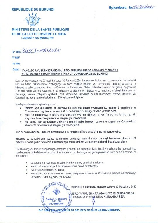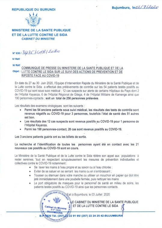 Voici le communiqué gouvernemental de ce vendredi 3 juillet 2020 : [ https://www.burundi-forum.org/wp-content/uploads/2020/07/bdi_burundi_Nouveau_Communique_COVID19_03072020.pdf ]