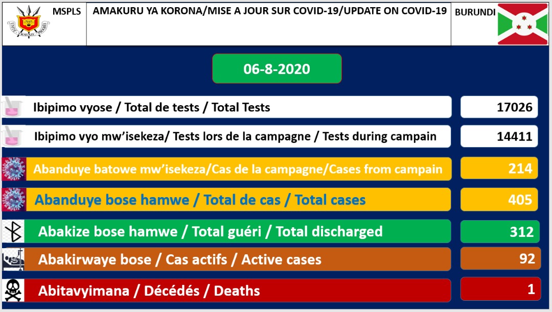 BUJUMBURA, 6/08/2020 – Le Ministère burundais de la Santé Publique (MSPLS) a sorti un communiqué de presse. Faisant le point sur la situation COVID-19 au Burundi.