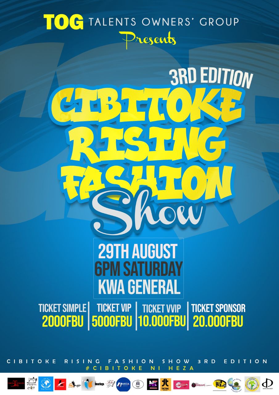 CIBITOKE ( Commune RUGOMBO ), 29/08/2020 – Talent’s Owners Group (TOG) a organisé une activité au bar chez Général. Il s’agissait du CIBITOKE RISING FASHION, 3ème édition. Du slam, de la danse traditionnelle, et un défilé de mode qui a permis de mettre en exergue les couturiers locaux et montrer leurs réalisations. 20 mannequins portaient des habits estampillés « Timiza Fashion » des maisons Bedel et Kokoye Cut Design.