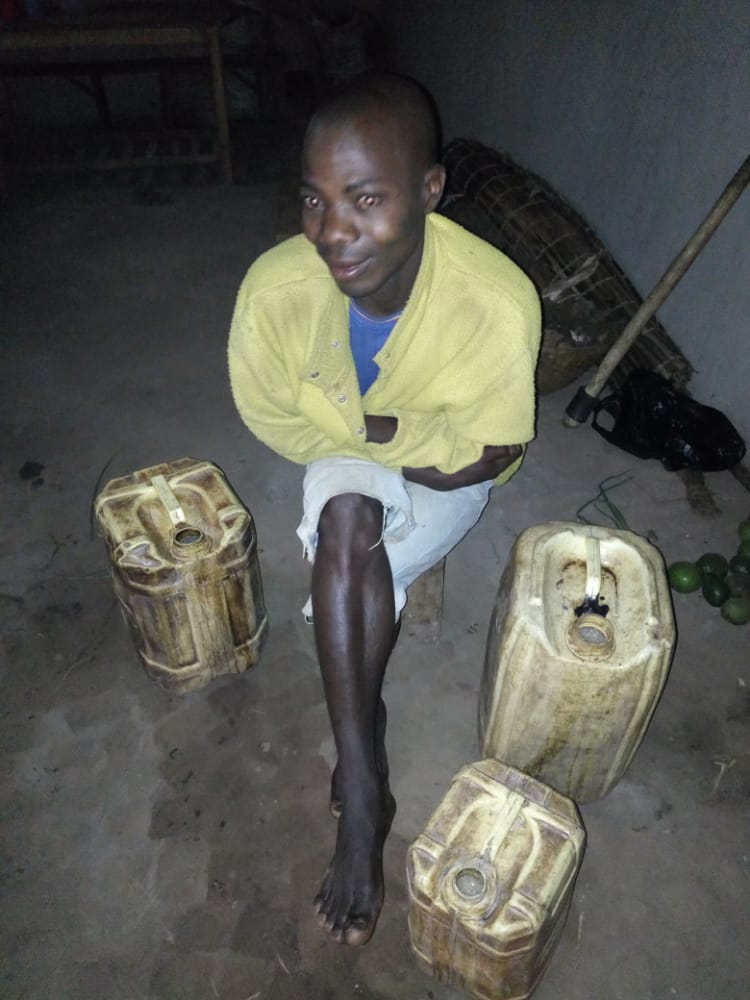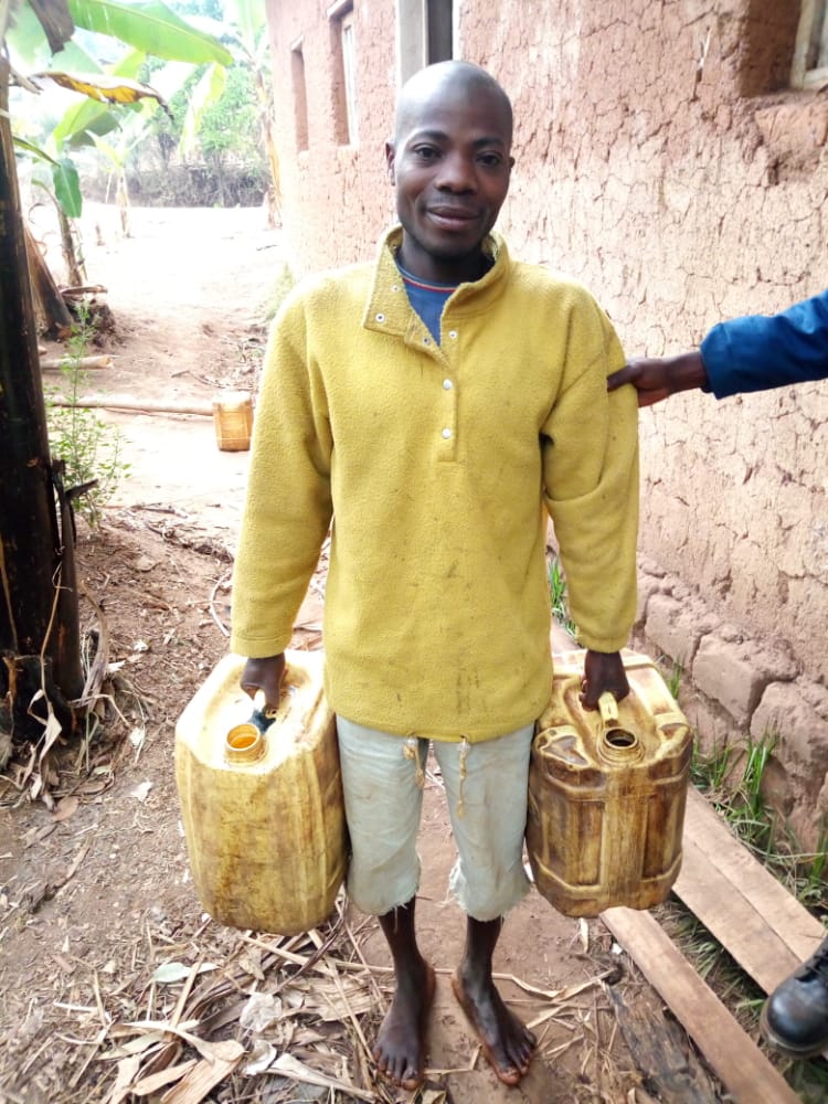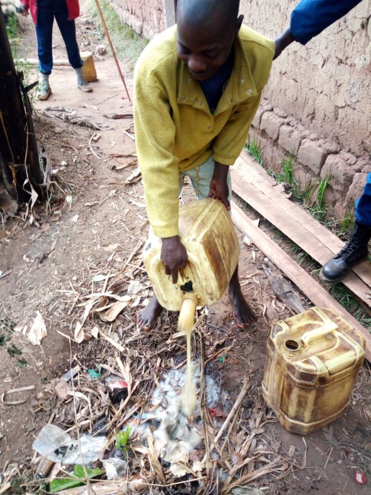 Cela faisait suite à une arrestation après une fouille – perquisition chez un citoyen tout à fait ordinaire de la localité. L’individu avait installé une distillerie chez lui d’une boisson prohibée ( une sorte d’alcool frelaté ) appelée UMUNANASI. 65 litres d’UMUNANASI ont été saisis.
